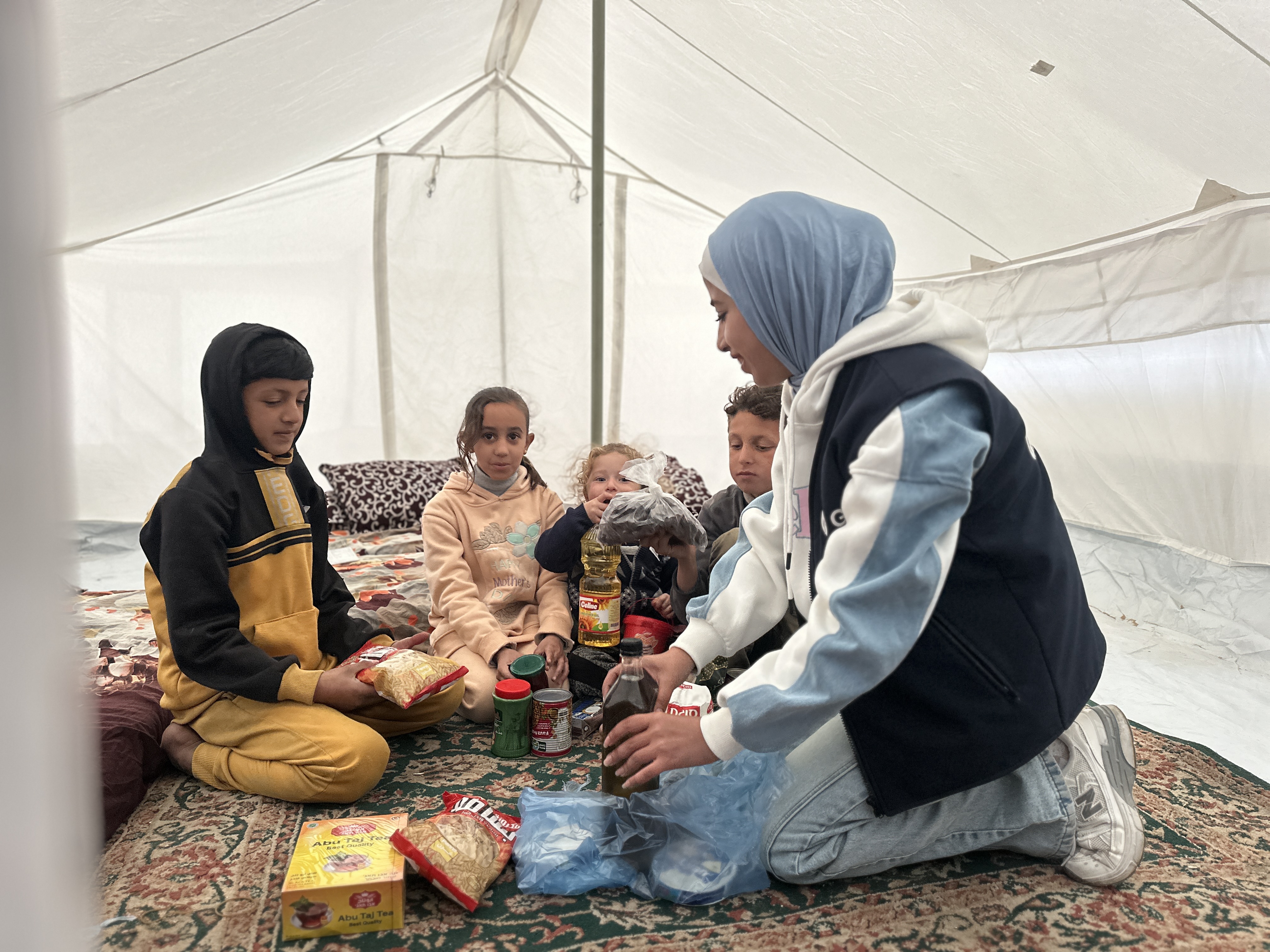 Each basket contained staple ingredients commonly used in Ramadan meals, including olive oil, dates, cheese, sugar and other essential food products. These items help families prepare simple but meaningful meals for iftar and support households that are currently facing severe economic hardship.